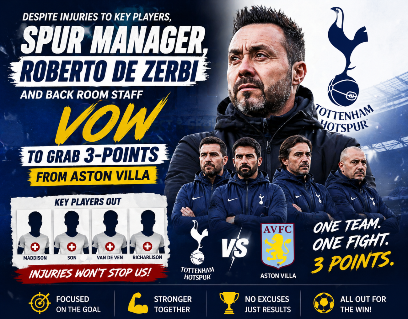 As the weekend clash approaches, tension and anticipation continue to build around Tottenham Hotspur. With injuries threatening to derail momentum at a crucial stage of the season, many would expect uncertainty to creep into the camp. Instead, a wave of confidence is sweeping through the club — led by manager Roberto De Zerbi and his trusted backroom staff, who have made it clear: Spurs are going all out for all three points against Aston Villa.